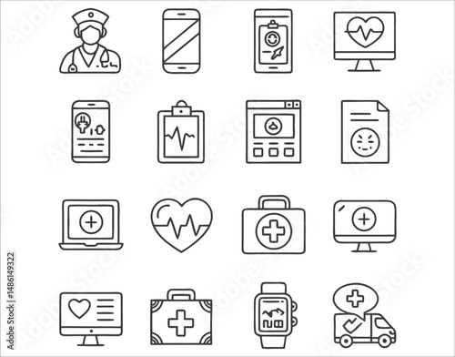 health care, cyberspace, health, doctor, outline, laptop, microscope, medicine, pictogram, insurance, hospital, assistance, blood, nurse, diagnosis, people, illustration, communication, virtual, network, datum, care, online, mobile, asking, treatment, disease, service, heart shape, patient, ambulance, computer, watch, check-up, smart, technology, phone, mobile phone, stethoscope, horizontal, app, distant, consultation, web, one person