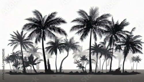 Black palm silhouettes. Tropical trees shadows. Variety beach palms with leaves. Oasis, para