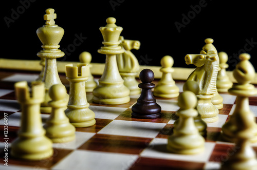 Black pawn on a chess board alone against all white pieces