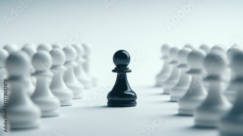 black pawn stands out among white pawns, symbolizing uniqueness and strategy in chess game. contrast highlights importance of individual pieces in gameplay