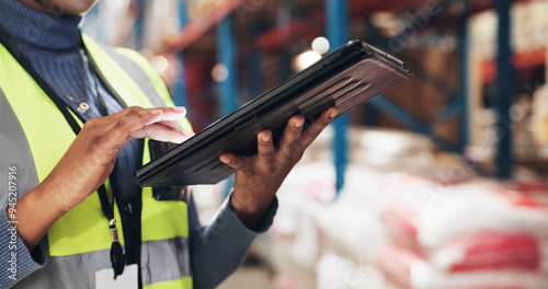 Black person, hands and tablet in warehouse for logistics, inventory check and stock management for web. Inspection, employee or supervisor with digital for shipping order, quality control and scroll
