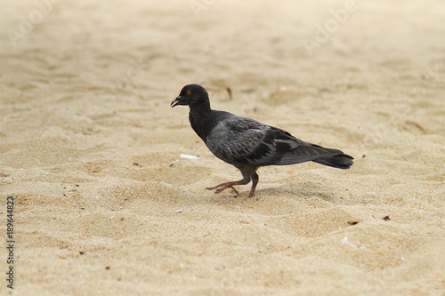 black pigeon on sand in beach