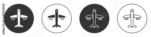 Black Plane icon isolated on white background. Flying airplane icon. Airliner sign. Circle button. Vector.