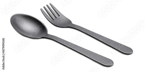 Black plastic spoon and fork, angled view