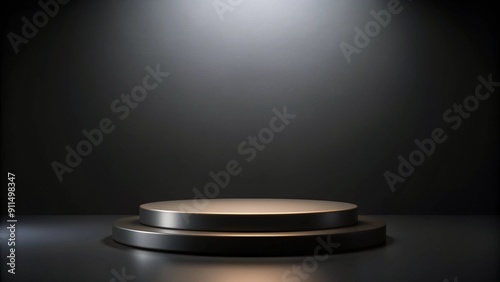 Black podium or pedestal display on dark background with long platform. Blank product shelf standing backdrop. 3D rendering.