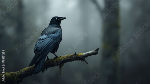 Black raven perched on mossy branch in foggy forest