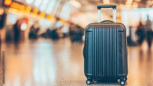 Black Rolling Suitcase on Airport Terminal Floor in Blurred Background with Passengers and Departure Boards Visible in Busy Travel Environment