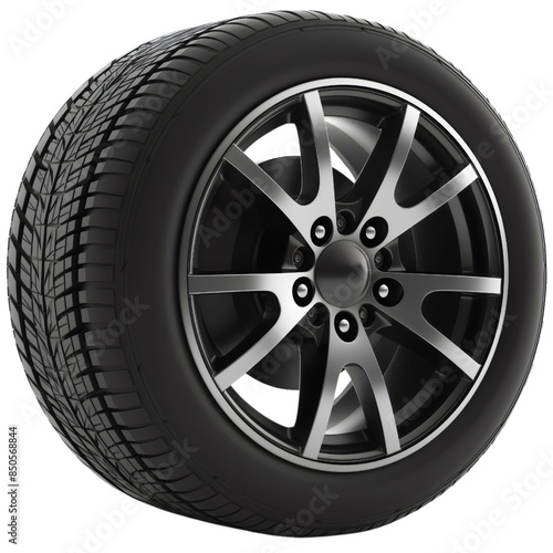 Black rubber car wheel tire object isolated on transparent background. Automobile transport part equipment, tyre with silver metal, steel or aluminum rim