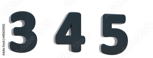 Black rubber. Numbers 3, 4, 5 . Alphabet 3d render. Isolated in white background. Path save.