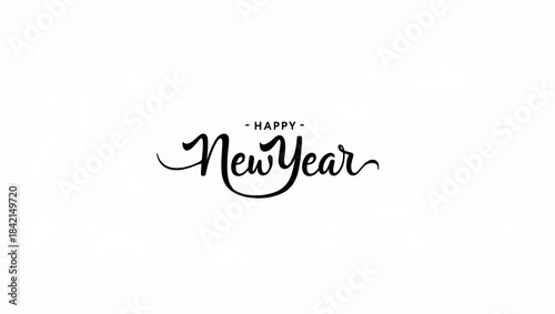 Black script Happy New Year lettering on white backdrop suited for minimal holiday branding elegant invitations and modern seasonal artwork