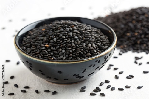 Black Sesame Seeds in Bowl and Scattered on White Surface