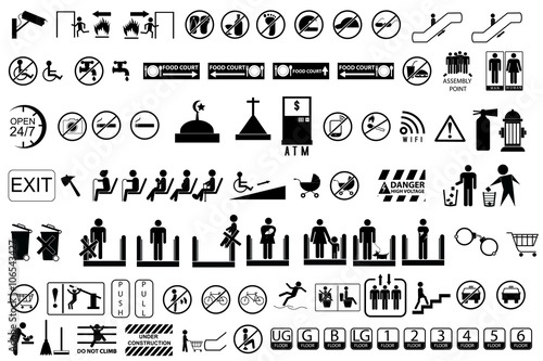 area, atm, building, cafes, camera, cart, cctv, hot drink, collection, direction, elevator, emergency, escalator, exit, floor, food, handicapped, icon, illustration, information, man, mother, urine, pet, excrement, prayer, public, eatery, room, service, set, shopping, signs, silhouette, smoking, stair, staircase, sticker, symbol, phone, privies, transportation, vector, wheelchair, wi-fi, woman