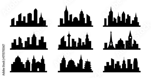 Black silhouette city skyline icons with landmark buildings