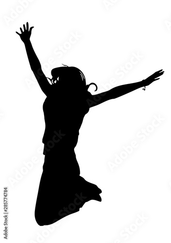 Black silhouette of a young joyful girl on a white background who jumps up