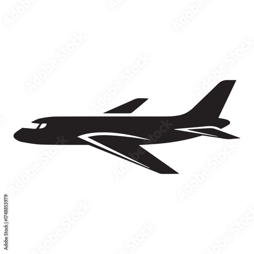 aeroplane, aircraft, jet, aviation, travel, transport, silhouette, icon, symbol, flight, wing, engine, fuselage, tail, sky, journey, vacation, global, transportation, commercial, passenger, half face, profile, graphic, design, simple, clean, modern, isolated, white background, vector, illustration, airborne, motion