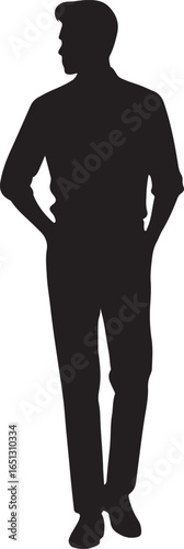silhouette, man, male, person, standing, looking away, profile, half face, black-and-white, isolated, white background, vector, graphic, illustration, figure, human, adult, casual attire, confident, pose, body, outline, simple, clean, graphic design, representation, character, single, full body, leg, arm, torso, head, shoulder, clothing, pant, shirt, footwear, shadow, shape, icon, symbol