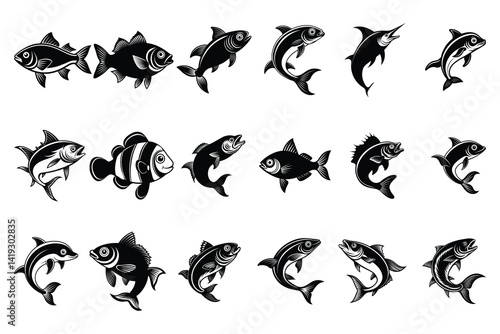 Black silhouette of fishes isolated with white background