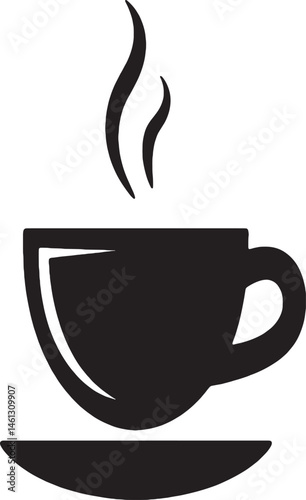Black Silhouette Of Steaming Coffee Cup On Saucer Minimalist Design.