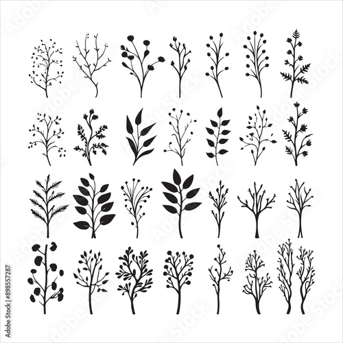 Black silhouette set of hand drawn tree branches with leaves botanical flowers floral hand drawn scandinavian style art silhouette on a white background
