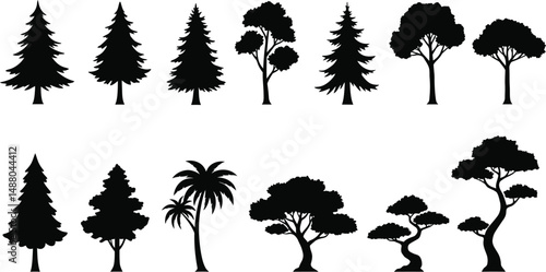 Black Silhouette Tree Vector Pack with Uniform Style and Simplified Forms of Common and Exotic Trees for Professional Designers.