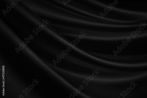 Black silk satin. Soft, wavy folds. Fabric surface. Luxurious black white background with copy space for design. Web banner.