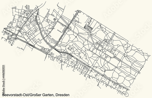 Black simple detailed street roads map on vintage beige background of the neighbourhood Seevorstadt-Ost/Großer Garten mit Strehlen-Nordwest quarter of Dresden, Germany