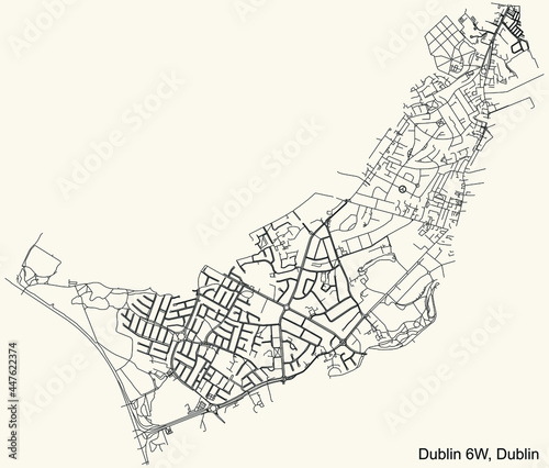 Black simple detailed street roads map on vintage beige background of the quarter Postal district 6W (D6W) of Dublin, Ireland