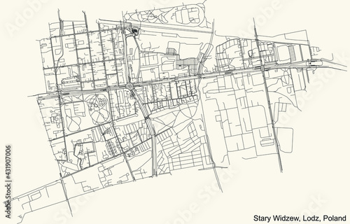 Black simple detailed street roads map on vintage beige background of the quarter Stary Widzew district of Lodz, Poland