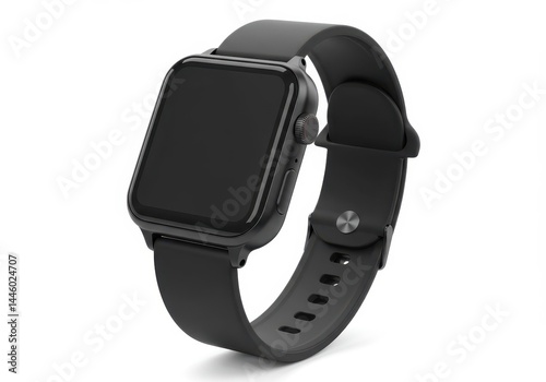 Black smartwatch with square face and rubber strap on white background
