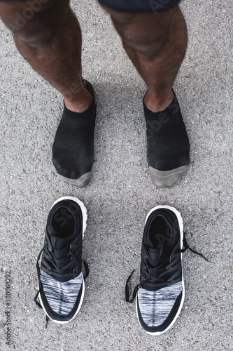 Black sneakers of a young black runner, close-up.