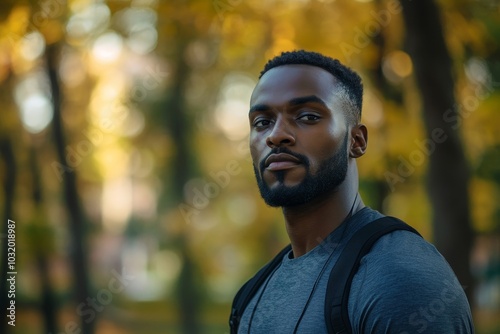 Black sports guy is training with a blurred background in the park, modern technology and an active lifestyle, Generative AI