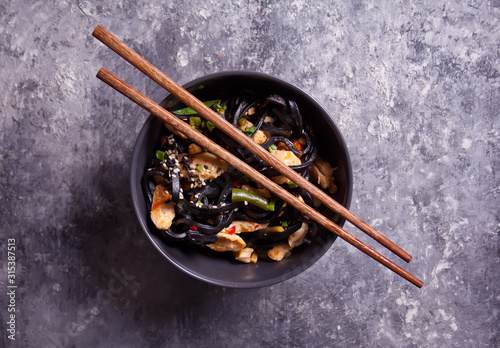 Black squid ink udon noodles with chicken meat in bowl with chopsticks on dark stone background. Top view.