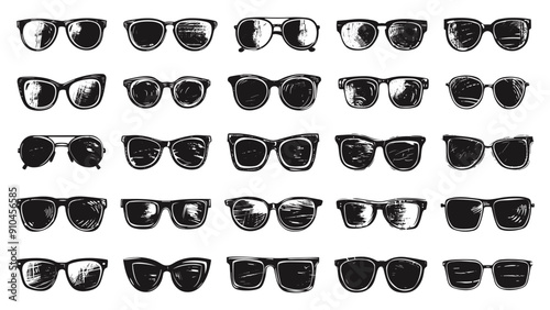Black Sunglasses Linocut Print Style Icons Set Neat Thick Strokes and Shapes Black on White Background Sunglasses Designs Eyewear Accessories Fashion Icons Graphic Design Elements