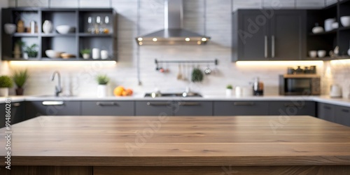 Black table with defocused kitchen background, blur, interior, furniture, decor, home, modern, minimalistic, contemporary