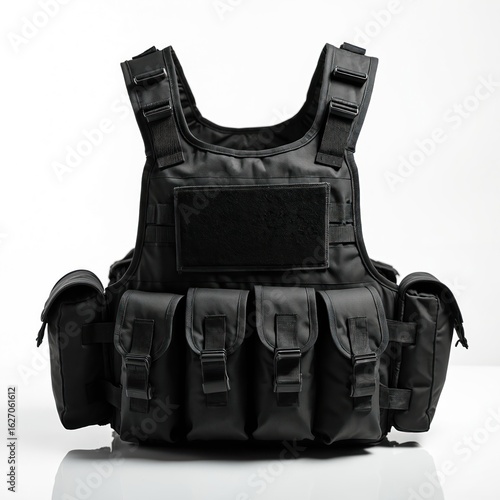 Black tactical vest with multiple pouches and adjustable straps, designed for security and military applications. This protective gear offers utility for law enforcement and outdoor activities.