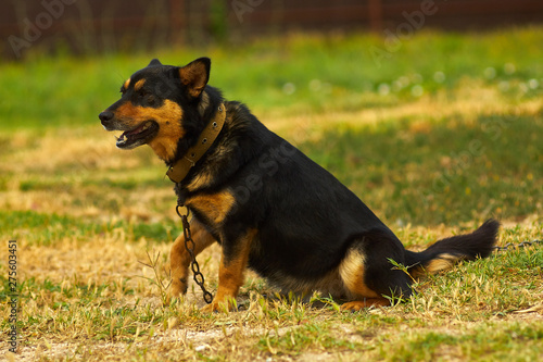Black Tan Dog Outdoor Sitting Ground Looking