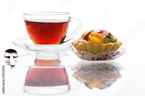 tea, tea-party, black, cup, fruit, tart, cupcake, sweet, ceylon, hot, drink, cake, spoon, glasses, tall, transparent, brown, gold, tasty, appetising, pekoe, sugar, plate, saucer, horizontal, white background
