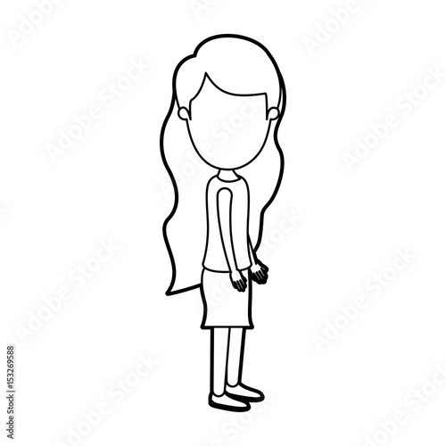 black thick contour caricature faceless full body girl with wavy long hair looking to side vector illustration