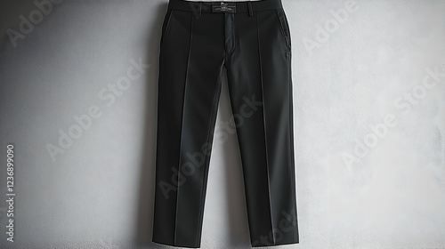 Black trousers hanging, minimalist background, clothing product shot, online shopping