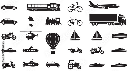 vehicle, transportation, icon, black, white, background, car, bus, bicycle, truck, motorcycle, helicopter, hot air balloon, sailboat, submarine, tractor, aeroplane, drone, silhouette, symbol, illustration, graphic, design, element, collection, set, various, transport, travel, white background, isolated, minimalistic, simple, line art, clip art, vector, graphic, visual, representation