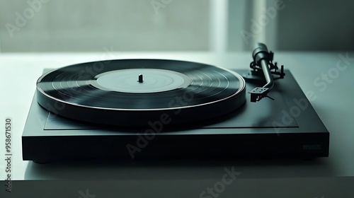 turntable, vinyl, record, player, music, audio, analog, black, white, surface, minimalism, modern, technology, high fidelity, stereo, sound, tonearm, needle, stylus, disc, groove, rpm, vintage, retro, classic, audiophile, listening, entertainment, home, studio, design, simple, elegant, clean, smooth, closeup, sharpened, shadow, light