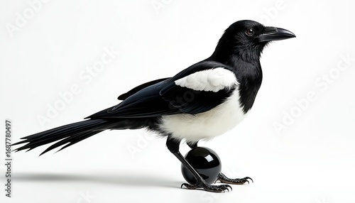 Black, white magpie bird stands on shiny black sphere against clean white background. Detailed feathers, sharp beak, claws visible. Contrast between bird plumage, smooth orb creates striking visual.