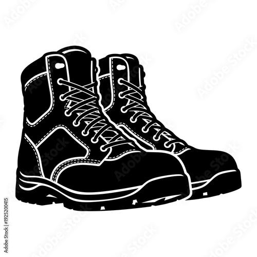 work boot, footwear, shoe, heavy duty, industrial, construction, safety, protection, rugged, hard-wearing, black boots, workwear, uniform, military, hiking, climbing, walking, apparel, clothing, accessory, equipment, gear, strong, tough, sturdy, sole, lace, stitching, illustration, graphic, icon, symbol, clean, isolated, white background, studio shot, topview, half face, pair, menswear, unisex, fashion, style, modern, art