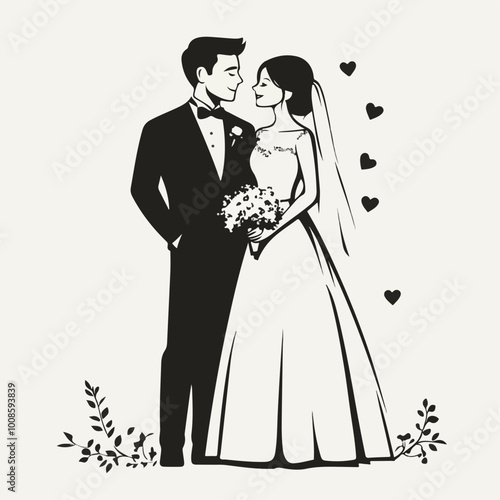 bride, groom, wedding, love, marriage, couple, heart, black-and-white, silhouette, romance, celebration, togetherness, oneness, romantic, formal, bride and groom, commitment, wedding day, elegant, bridal gown, tuxedo, honeymooners, classic, timeless, simplicity, bridal bouquet, affection, happiness, wedding ceremony, joyful, bond, emotional, vector, illustration, married, flower, bridal, wife, cartoon, invitation