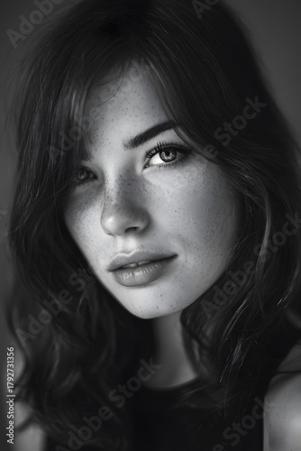 woman, beauty, face, hair, model, eye, fashion, people, black, person, brunette, 1, make-up, head, lip, glamour, closeup, youth, skin, studio, expression, smiling, smile, eye, thinking, black-and-white, portrait, beautiful, attractive, female, dark hair, monochrome, elegant, artistic, soft focus, timeless, graceful, detailed, high contrast, feminine, aesthetic, expressive