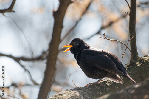tree branch, blackbird, bird, animal, autumn, beak, beautiful, blossom, close, closeup, colourful, conifer, contrast, day, display, europa, european, feather, field, flower, forest, looking, male, nature, park, portrait, season, sing, sitting, song, spring, sunny, tree, up, wild, wildlife, wing