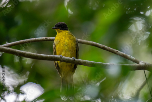Black-capped Bulbul perches gracefully on a slender branch, its vivid yellow body contrasting strikingly with its glossy black head. Surrounded by lush green foliage, the bird’s alert gaze and sleek.