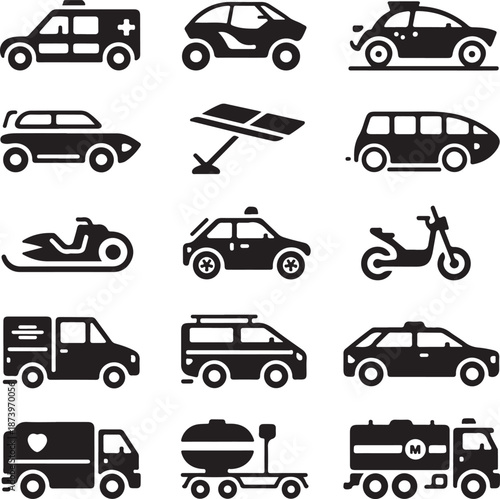 vehicle, car, truck, ambulance, motorcycle, snowmobile, aeroplane, van, taxi, cement mixer, train, transport, icon, silhouette, black, graphic, symbol, illustration, signs