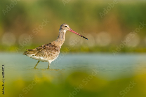 Black-tailed godwit (Limosa limosa) a beautiful shorebird standing in the water of a muddy lake. Detailed portrait of a wader in its habitat. Wildlife scene from nauture. Hungary