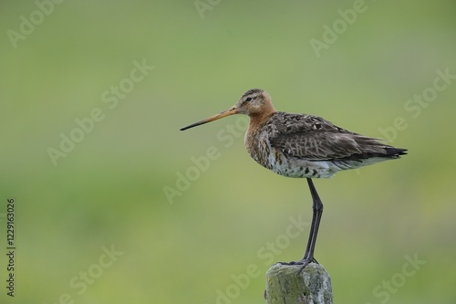 Black-tailed Godwit (Limosa limosa) perched on a post, Texel, The Netherlands, Europe